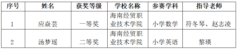 近日,省教育厅公布海南省首届大学生教师技能大赛获奖名单。海南经贸职业技术学院参赛学生应焱芸、汤梦瑶在本次赛事中表现优异,斩获佳绩,分别荣获一等奖、二等奖。